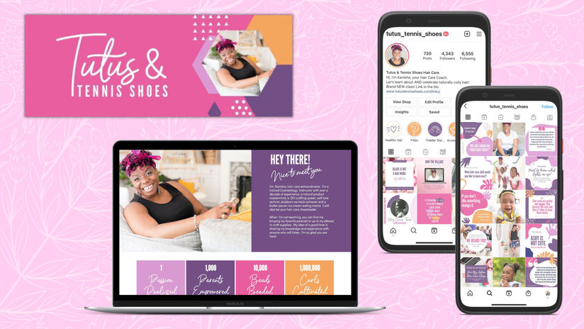 Kanisha hired me to overhaul her entire brand. We started with a fun & colorful branding photo session, then updated her logo, brand colors and website. The next step was planning out and designing her online hair care course. The course has been a huge success and a game changer for her business! In the last two years, Kanisha has added on monthly social media post design to keep her online presence consistent and gorgeous.